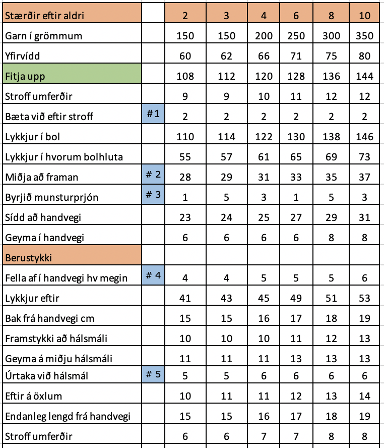 Meðfylgjandi er tafla sem sýnir helstu tölulegar leiðbeiningar í stærðum 2ja til 10 ára.