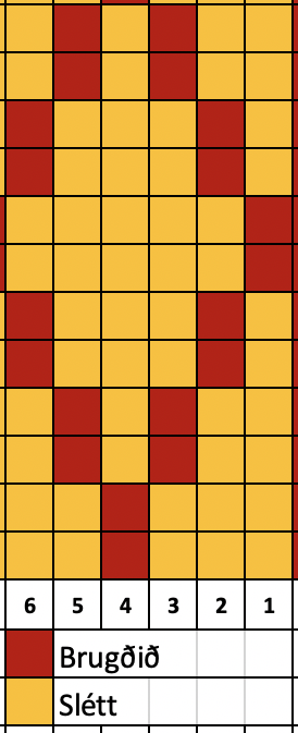 Fyrsta og síðasta lykkjan á framhluta er prjónuð brugðin en munsturprjón þar á milli.  Lykkjur á bakhluta eru prjónaðar sléttar. Athugið að byrja á réttum stað í munstrinu til að fá miðjutígulinn á réttum stað = # 3.